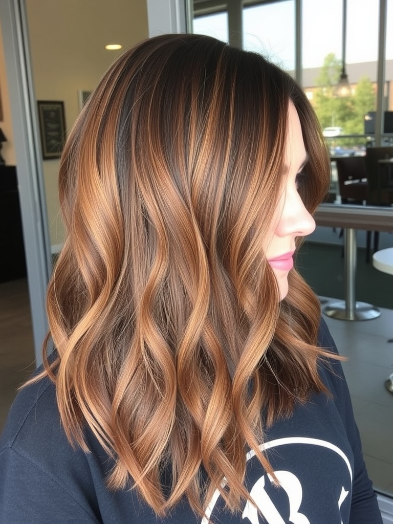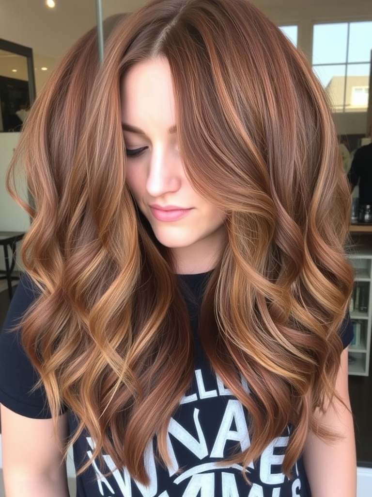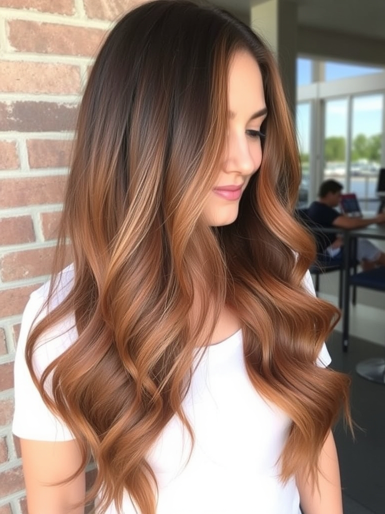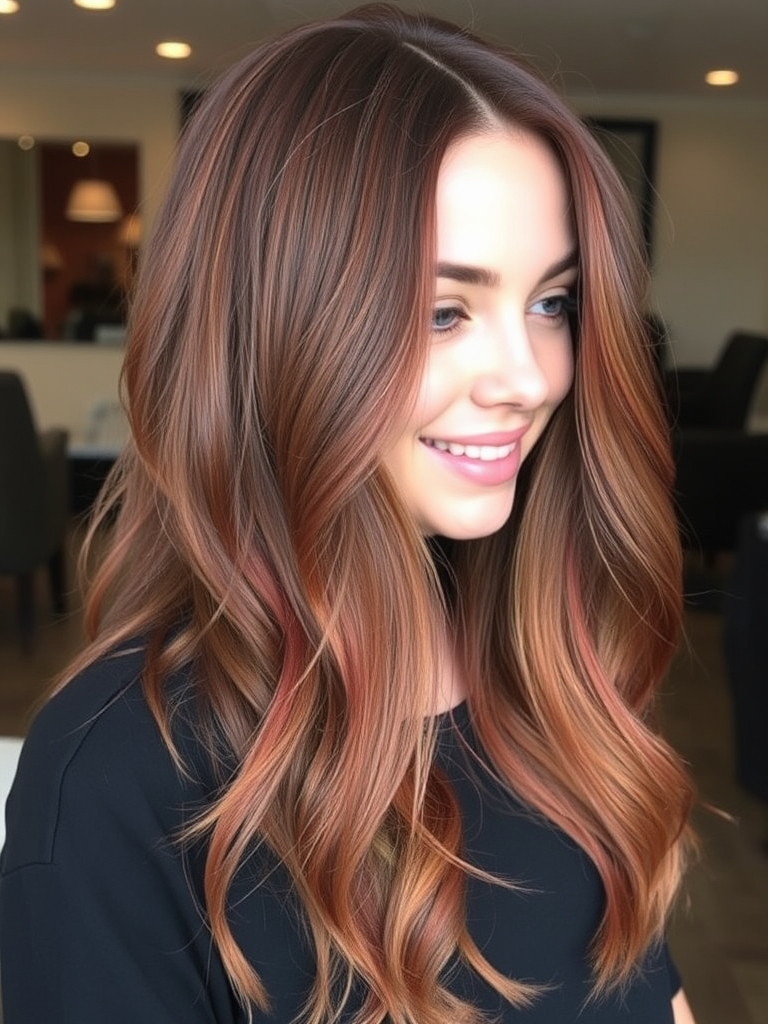 Achieve a harmonious blend of hues with Brown And Copper Balayage enhanced by Copper Highlights Colors Fall Hair. The rich brown tones seamlessly transition into vibrant copper, making this style perfect for fall. This look pairs beautifully with Honey Brown Hair and works well on long, wavy hair for a natural, flowy effect. It’s a great option for those seeking a seasonal update with minimal upkeep. Add Sparkly Hair Accessories to make the copper tones stand out for special occasions or casual outings. This versatile look is perfect for both everyday wear and glamorous events.