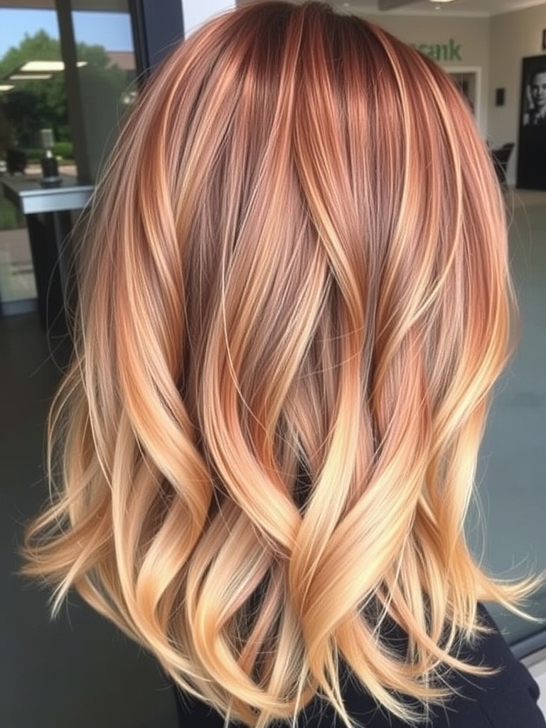 Achieve a seamless blend of tones with Blonde Ombre Balayage featuring Copper Highlights Colors Fall Hair. The transition from blonde to copper adds depth and vibrancy, perfect for a fall-inspired hairstyle. This look works exceptionally well for fans of Hair Color Caramel, offering a sophisticated and trendy option for medium to long hair. Add Sparkly Hair Accessories to elevate the style, making it suitable for both casual outings and formal occasions.