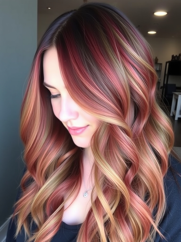 Make a bold statement with Red And Green Hair Color paired with Copper Highlights Colors Fall Hair. This daring color combination is ideal for those looking to experiment with unique, autumn-inspired styles. The copper highlights tie the red and green hues together, creating a harmonious and striking look. Perfect for fans of Hair Colors For Curly Hair, this style works beautifully on wavy or curly textures. Add Sparkly Hair Accessories for an extra touch of glamour, making this look perfect for the season.