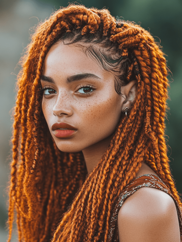 Channel your inner boldness with the Ginger Braids Boho Hairstyle and Neon Girl vibes. This style features edgy braids infused with vivid ginger tones, creating a modern yet bohemian look. Pair it with a Luxury Gold Plated Delicate Pearl Necklace or Jeweled Metal Jewelry Sets For Party for a statement finish. Keep your braids flawless with Hair Maintenance Tips, ensuring they maintain their structure and shine. The interplay of ginger tones and Rose Blood accents adds a pop of brightness, making this a perfect hairstyle for adventurous, fashion-forward individuals.