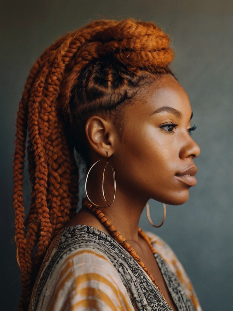 Celebrate artistry with the Ginger Braids Boho Hairstyle, inspired by Black Woman Artwork. This style combines the warmth of ginger tones with unique braid patterns that mimic intricate designs found in cultural artwork. Perfect for showcasing individuality, this look pairs well with a Luxury Gold Plated Delicate Pearl Necklace or Jeweled Metal Jewelry Sets For Party. Keep your braids neat and defined with tips from Hair Maintenance Tips, ensuring long-lasting style. This hairstyle is ideal for those who love blending culture and fashion, making it a standout choice for any occasion. Highlight the beauty of Ginger Hair With Blue Eyes or pair it with bold makeup for added impact.