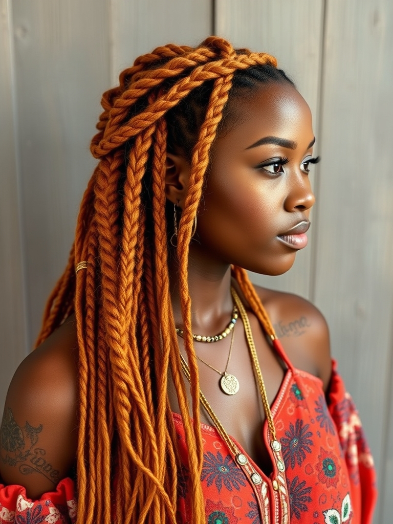 Elevate your Ginger Braids Boho Hairstyle by incorporating Boho Red Hair details. The combination of bold red highlights with soft ginger tones creates a vivid and dynamic look that’s perfect for any occasion. Add a touch of glamour with a Jeweled Metal Jewelry Set For Party or Elegant Bracelets With Heart Charm For Gift. Use Hair Maintenance Tips to preserve the vibrancy and texture of your braids, ensuring they stay photo-ready all day. Whether styled casually or elegantly, this look is ideal for celebrating individuality and adding a pop of color to your style.