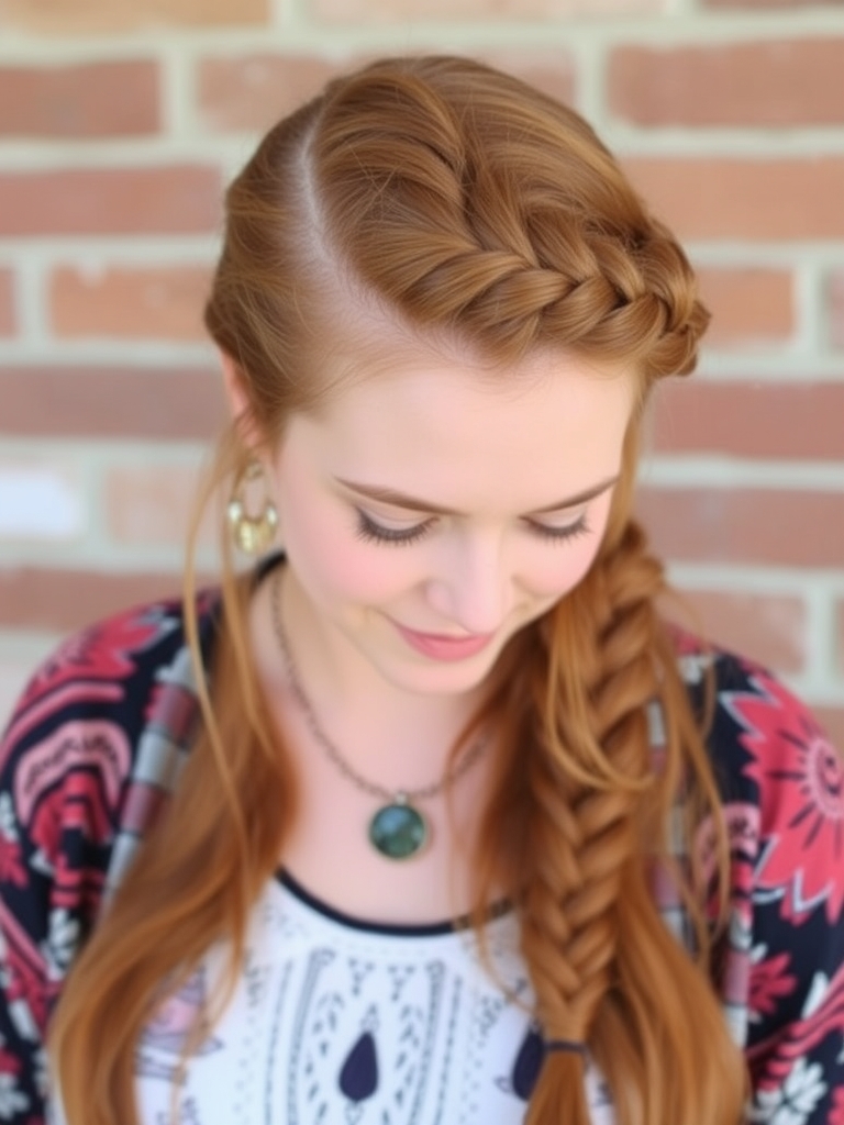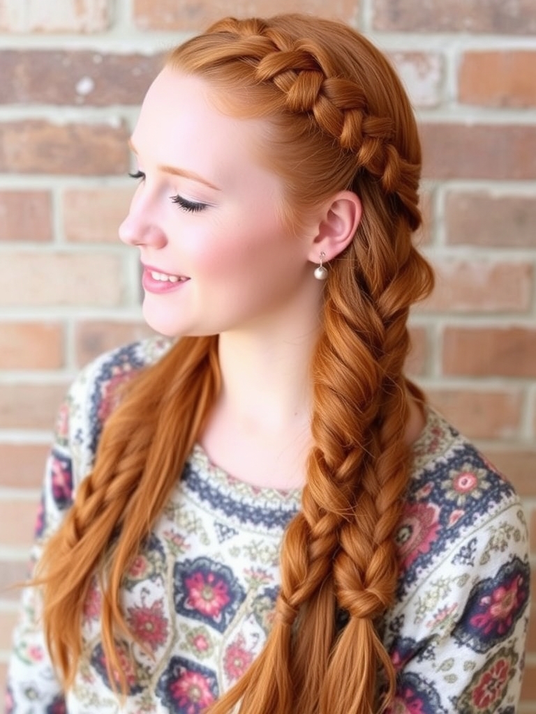Add a glamorous twist to the Ginger Braids Boho Hairstyle with the Side Swept Braid design. This style features a single braid swept to one side, creating an asymmetrical and dramatic effect. Ideal for evening events or formal occasions, it pairs beautifully with a Luxury Gold Plated Delicate Pearl Necklace or Elegant Bracelets With Heart Charm For Gift. Use Hair Maintenance Tips to keep your braid sleek and sophisticated throughout the event. The richness of ginger tones and Rose Blood hues enhances this look, making it a statement style for anyone seeking elegance and flair.