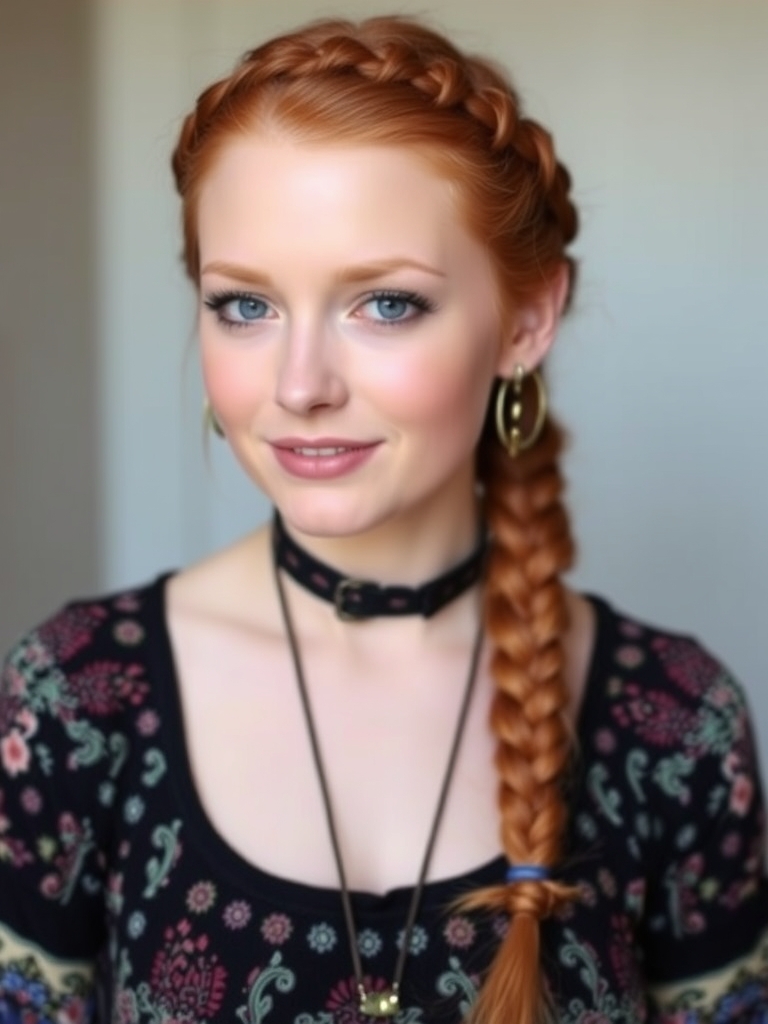 Channel your inner bohemian with the Ginger Braids Boho Hairstyle, inspired by Doll Face Beauty vibes. This look emphasizes soft, intricate braids paired with loose, face-framing strands to create a dreamy and ethereal aesthetic. The hairstyle is best complemented by subtle accessories like Elegant Bracelets With Heart Charm For Gift or a Luxury Gold Plated Delicate Pearl Necklace. Use Hair Maintenance Tips to keep your braids defined and frizz-free throughout the day. This style works wonderfully with outfits such as Linen Tops With Lapel Collar And Patch Pockets, adding an effortlessly chic touch. Highlight the beauty of Ginger Hair Photoshoot opportunities with this romantic hairstyle that brings out your natural charm.